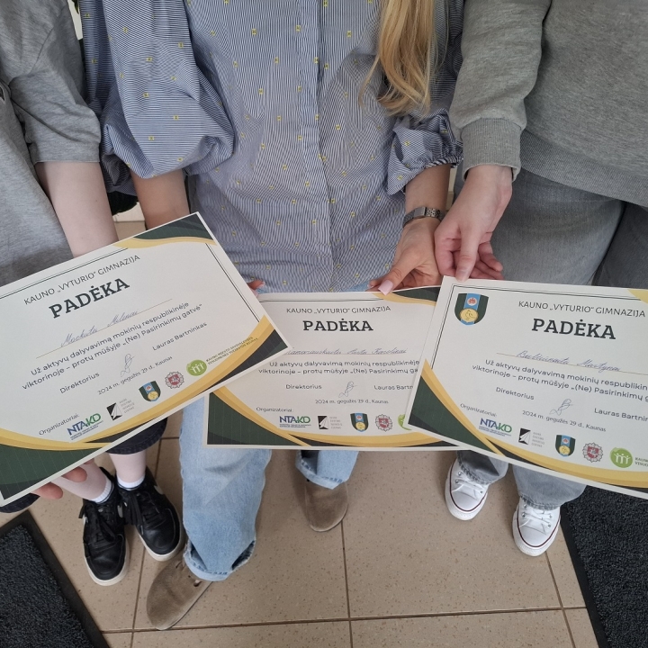 Nuoširdžiai džiaugiamės gimnazijos mokinių komanda: Martyna Balčiūnaite, Viktorija Acaite, Maya Callista Guenec, Aiste Karolina Kamarauskaite, Milena Mockute, prisijungus ir aktyviai dalyvavus respublikinėje 7-9 klasių mokinių viktorinoje – protų mūšyje „(Ne) pasirinkimų gatvė“. Viktorina skirta atkreipti bendrojo ugdymo mokyklų bendruomenių dėmesį į alkoholio, tabako ir kitų psichiką veikiančių medžiagų vartojimo problemas tarp mokinių bei formuoti jų teigiamas vertybines nuostatas, skatinančias sveikai gyventi!