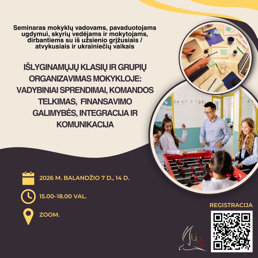 Vilniaus lietuvių namų Užsienio lietuvių švietimo skyrius 2026 m. balandžio 7 d., 14 d. (15.00–18.00 val.) kviečia į nuotolinį seminarą, skirtą mokyklų vadovams, pavaduotojams ugdymui, skyrių vedėjams ir mokytojams, dirbantiems su iš užsienio grįžusiais / atvykusiais ir ukrainiečių vaikais – „Išlyginamųjų klasių ir grupių organizavimas mokykloje: vadybiniai sprendimai, komandos telkimas, finansavimo galimybės, integracija ir komunikacija“. Seminare bus aptariamas išlyginamųjų klasių organizavimas ir integracija, remiantis Vilniaus lietuvių namų patirtimi. Taip pat bus aptarta, kaip valdyti kultūrinę įvairovę ir stiprinti bendradarbiavimą, remiantis Šiaulių „Santarvės“ gimnazijos patirtimi.