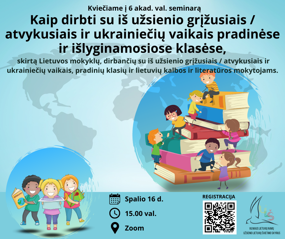 Spalio 16 d. 16.00 val. kviečiame Lietuvos mokyklų pradinių klasių ir lietuvių kalbos ir literatūros mokytojus, dirbančių su iš užsienio grįžusiais/atvykusiais ir ukrainiečių vaikais, dalyvauti Vilniaus lietuvių namų Užsienio lietuvių švietimo skyriaus organizuojamame nuotoliniame 6 akad. val. seminare, „Kaip dirbti su iš užsienio grįžusiais/atvykusiais ir ukrainiečių vaikais?”